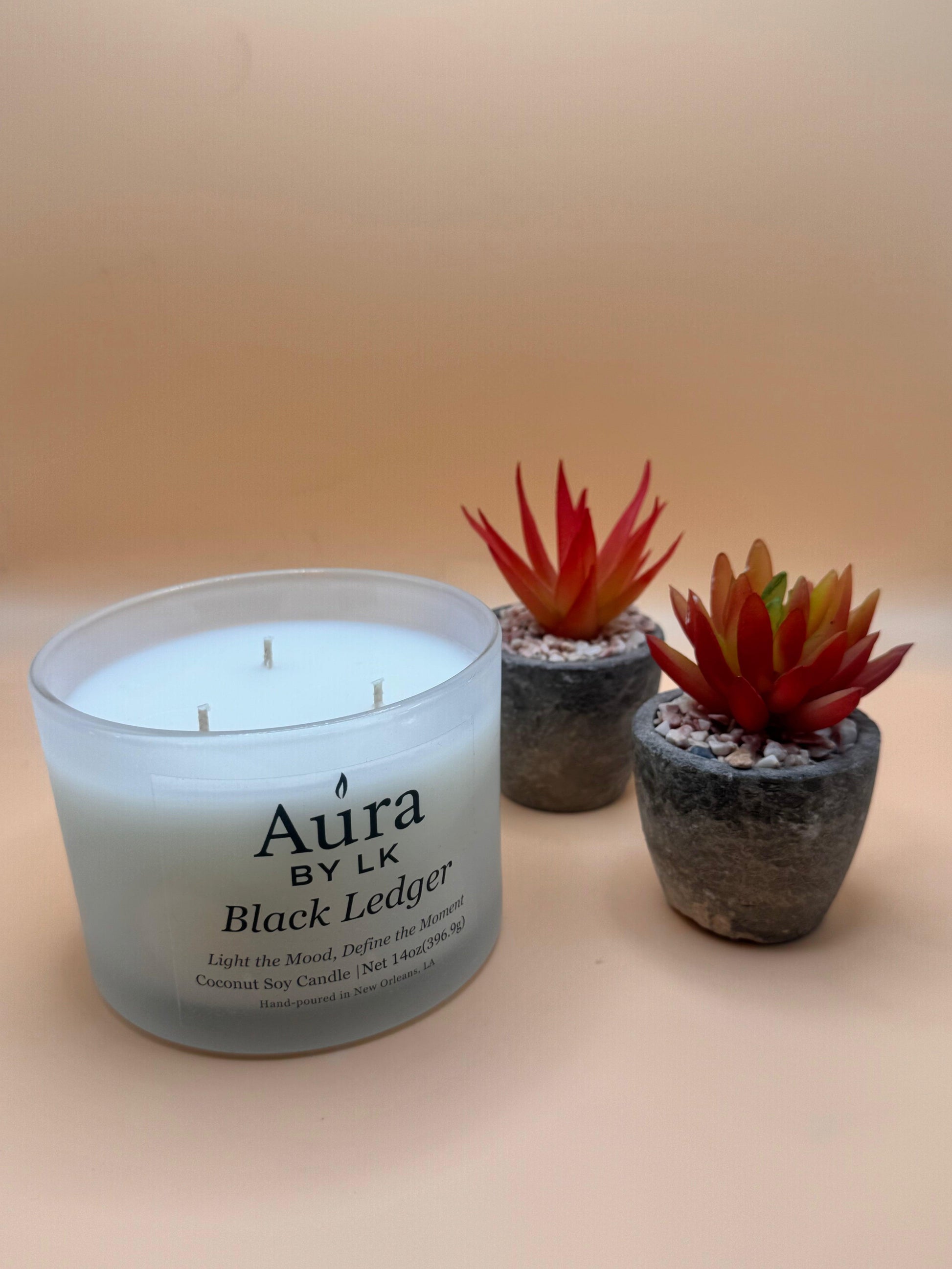 Triple-wick coconut soy candle poured in a sleek 16oz frosted glass jar. Net Wt. 14oz / 396.9g