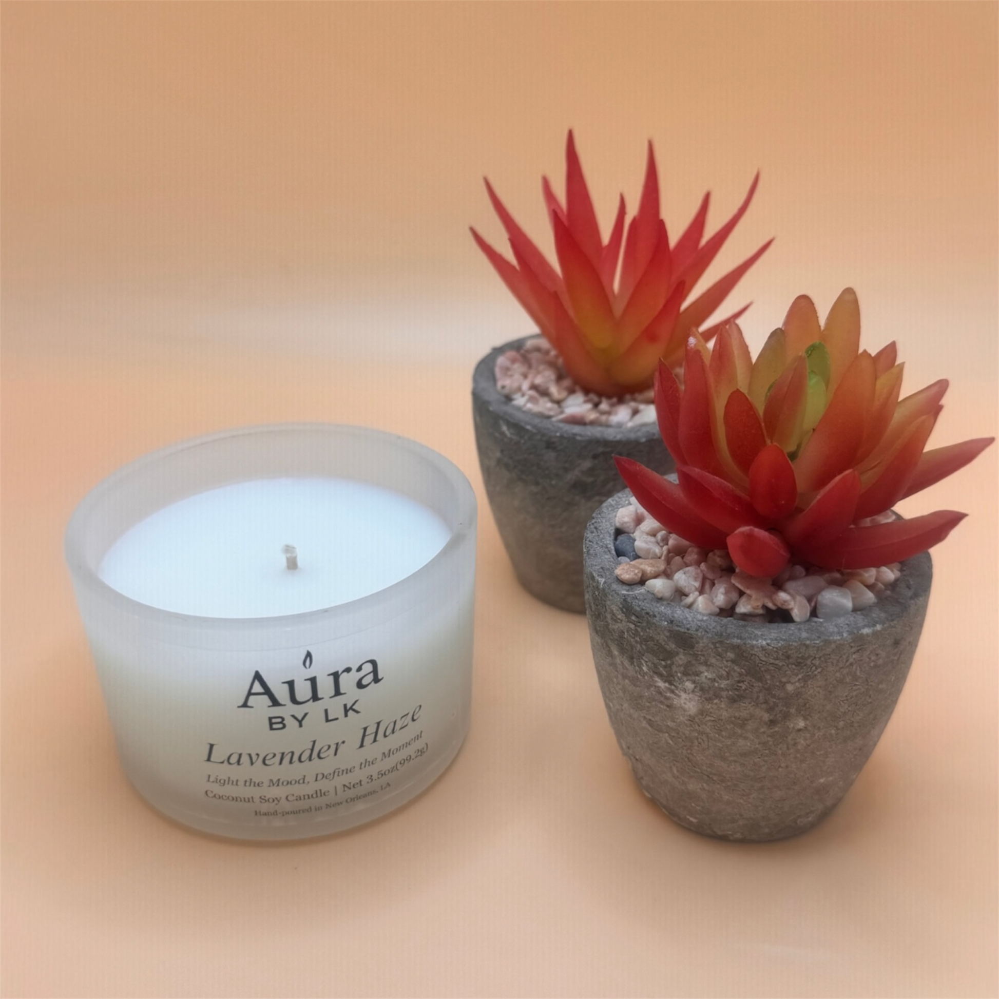 Single-wick coconut soy candle poured in a sleek 4oz frosted glass jar. Net Wt. 3.5oz / 99.2g
