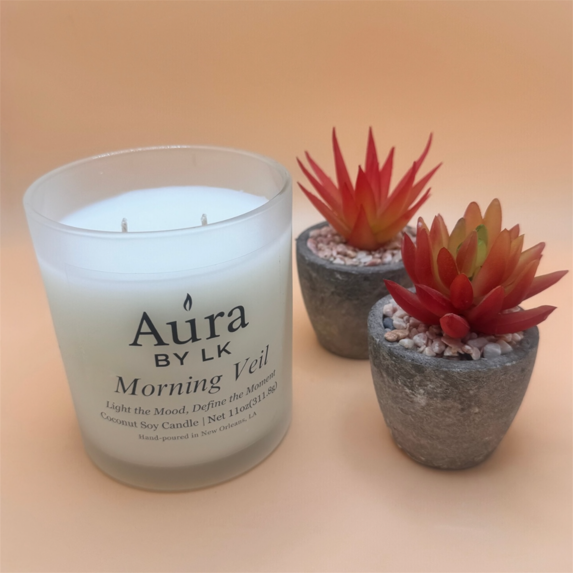 Double-wick coconut soy candle poured in a sleek 12oz frosted glass jar. Net Wt. 11oz / 311.8g