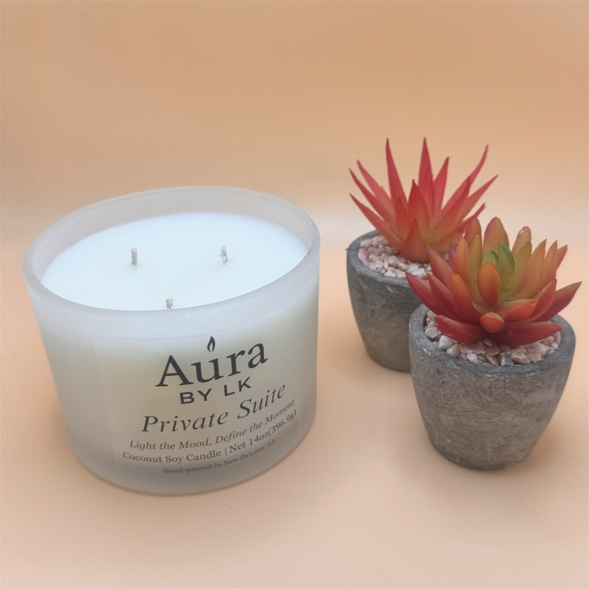 Triple-wick coconut soy candle poured in a sleek 16oz frosted glass jar. Net Wt. 14oz / 396.9g