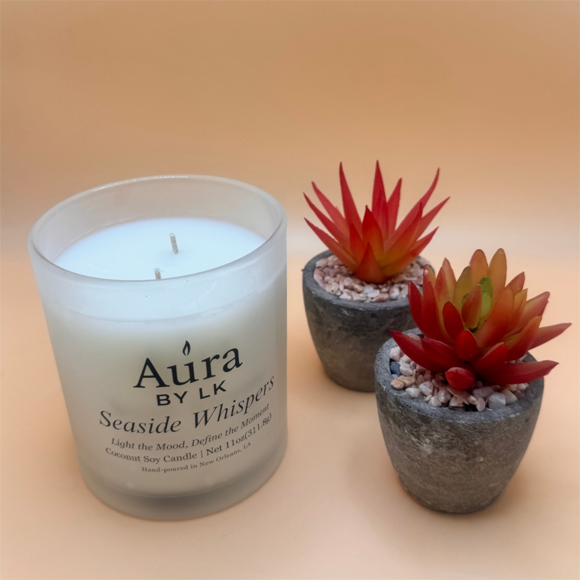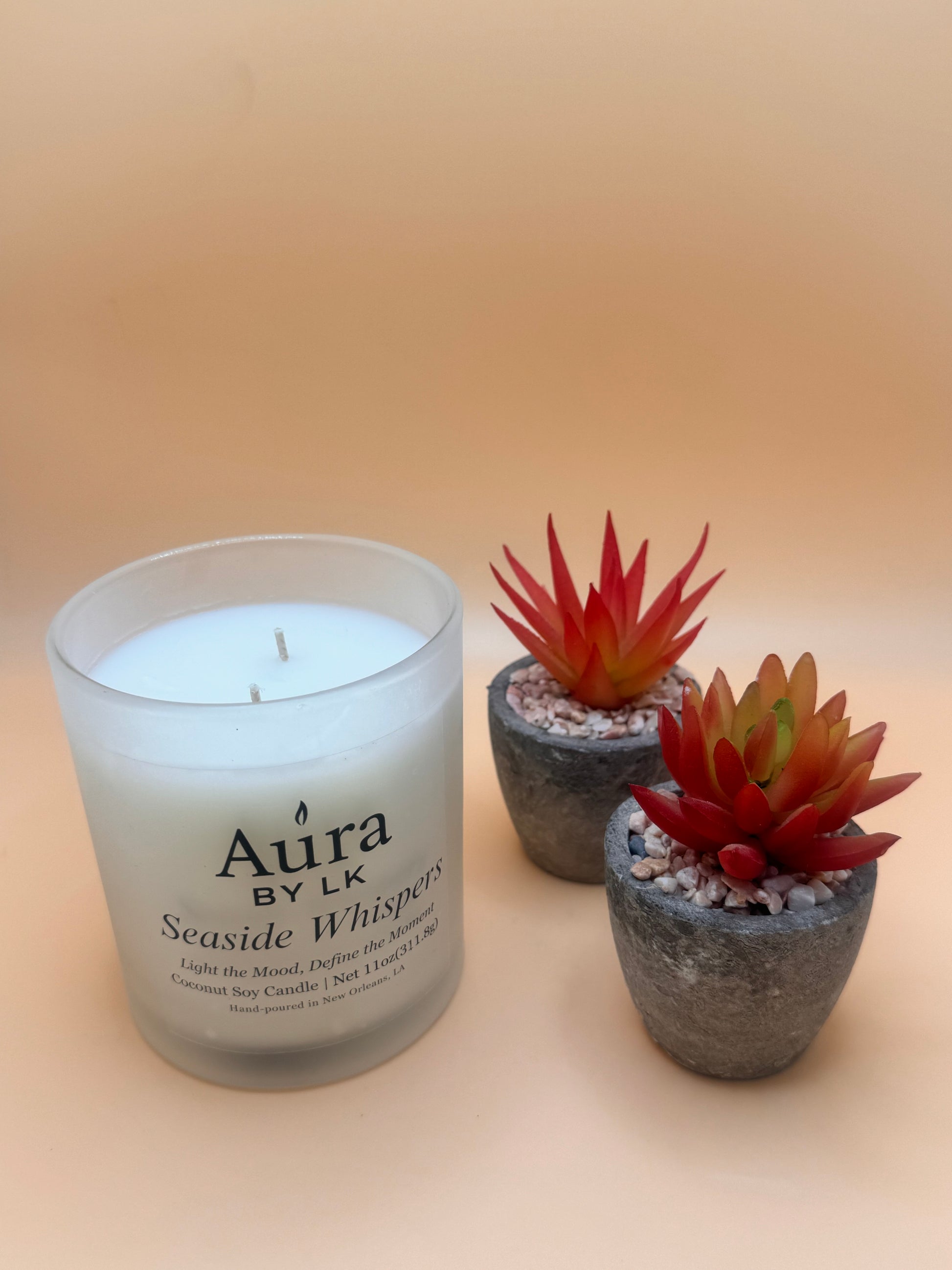 Double-wick coconut soy candle poured in a sleek 12oz frosted glass jar. Net Wt. 11oz / 311.8g