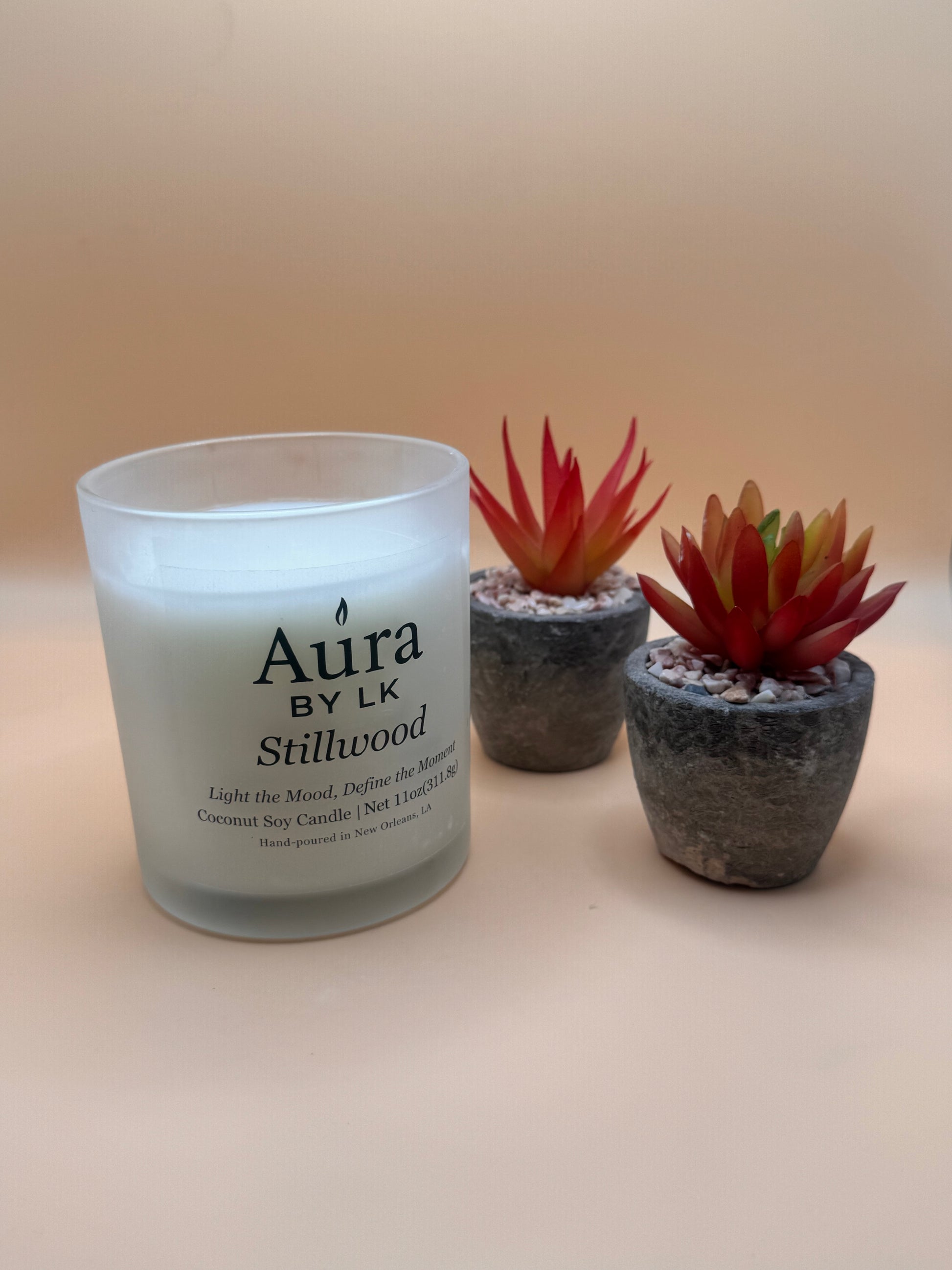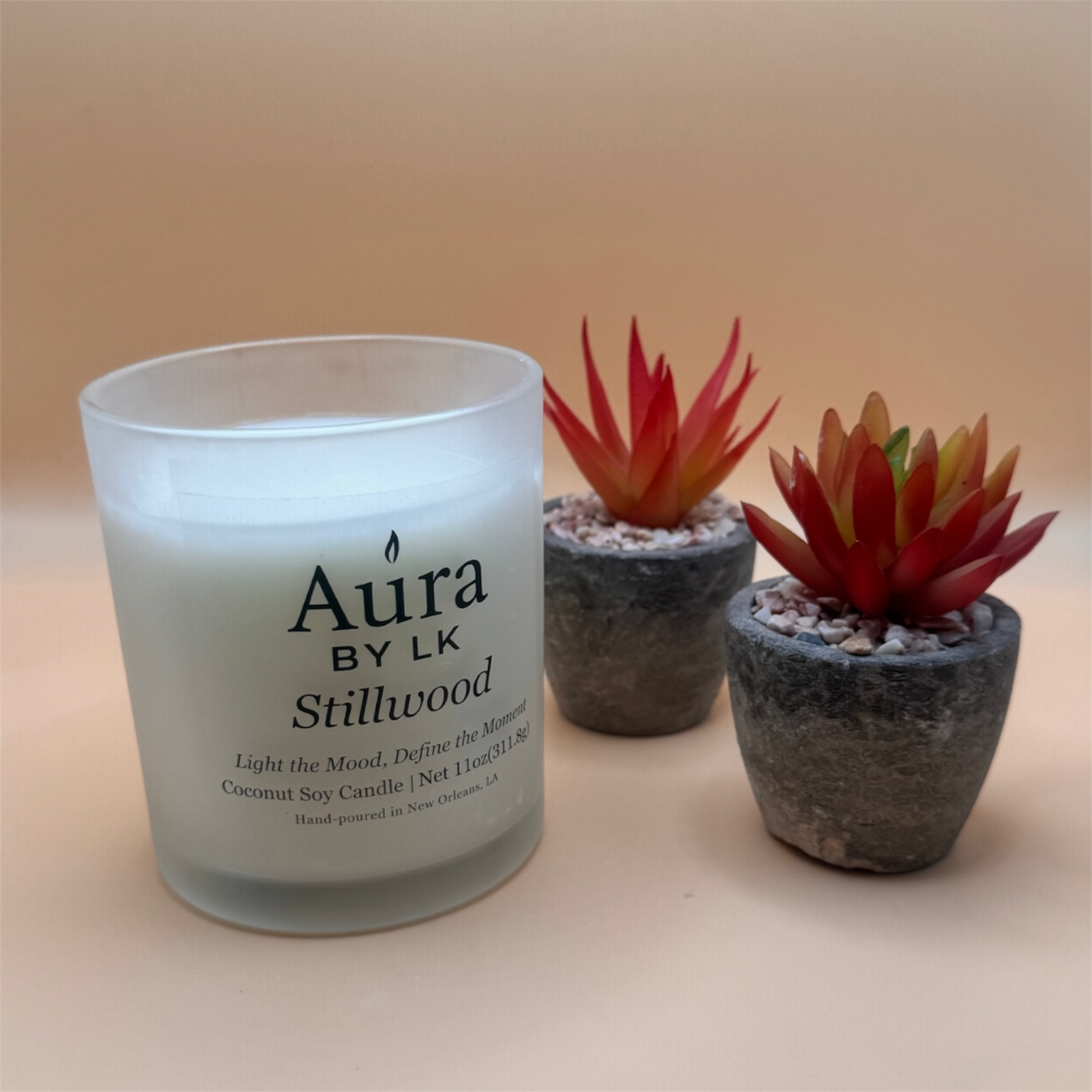 Double-wick coconut soy candle poured in a sleek 12oz frosted glass jar. Net Wt. 11oz / 311.8g