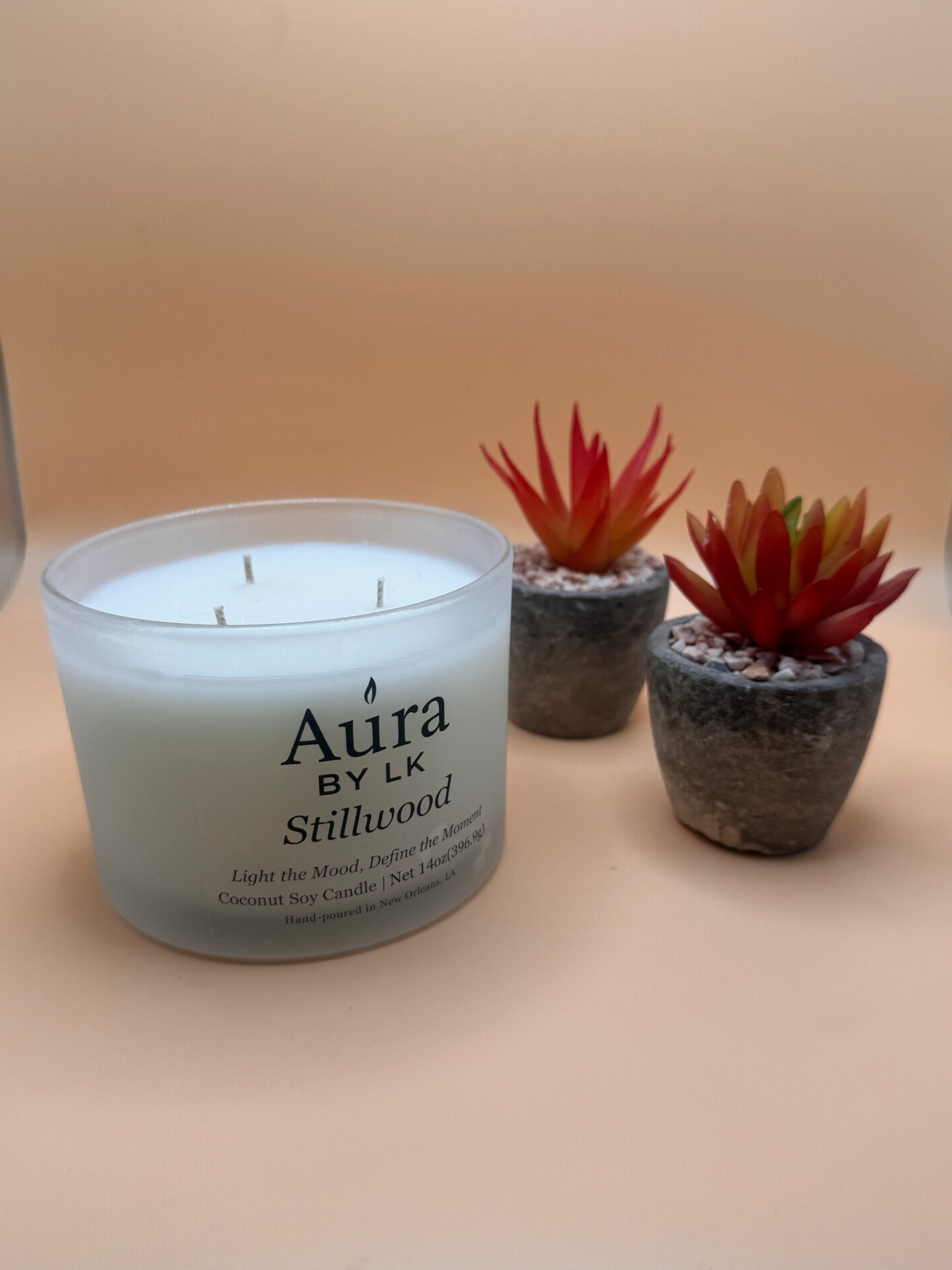 Triple-wick coconut soy candle poured in a sleek 16oz frosted glass jar. Net Wt. 14oz / 396.9g